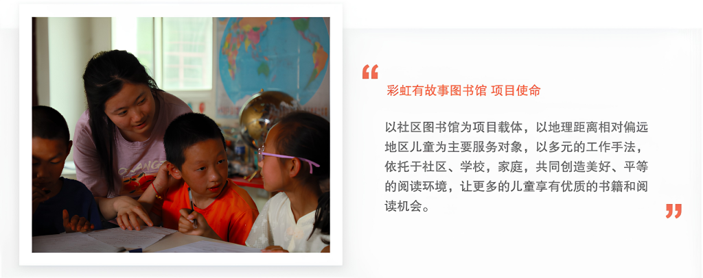 彩虹有故事图书馆致力于提升困境儿童的阅读品质,丰富儿童的童年生活。通过打造舒适、安全、友好的阅读与学习环境,提供丰富多样的优质图书,并持续开展多彩有趣的阅读与兴趣活动,陪伴儿童发现兴趣、发展能力、拓展视野。